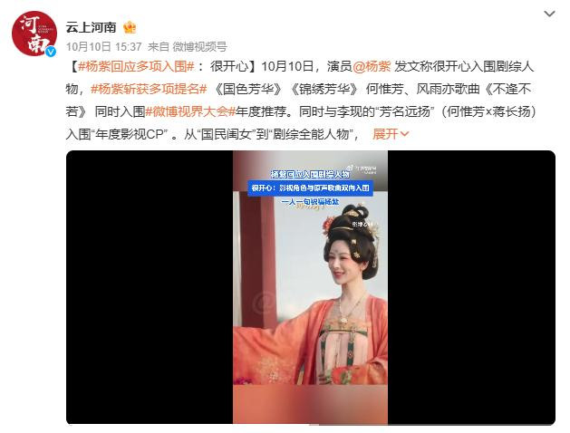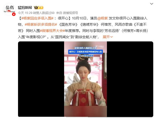 近日,多家官媒接连发文,高调官宣杨紫入围“微博视界大会年度推荐”。
