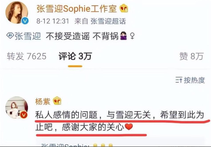 尽管杨紫后来为张雪迎澄清两人分手和她没有关系,但她与秦俊杰的恋情最终还是走到了尽头。